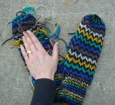 These sorts of mitts usually serve me nicely to late December, when the temperature starts dropping below about -10 degrees C during the day. At that point, however, I have to resort to commercially bought mittens.