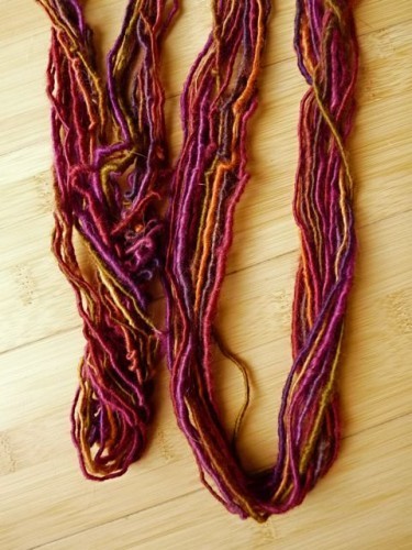 I held the two strips together as a spun my singles, creating a marled single. Then plied the singles together in a 2-ply. The effect is densely mixed up colors. My favorite kind of marl so far.