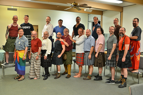 Pictures that make our day: a portrait of the kilt and sarong parade at the recent West Coast Men's Knitting Retreat, held in Washington State.