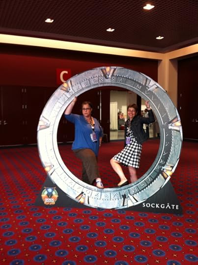 Amy and Kate pose in the Sockgate, a surprise from organizer Tina to organizer Stephanie (and lots of fun for the attendees to pose in)