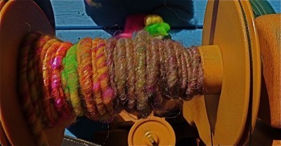 I plan to corespin all of the fiber, grabbing the fiber randomly from a big bowl. Sometimes I use all of the .5 ounce in one shot, sometimes I only use half. I am amazed at how it's all coming together. Corespinning really showcases the fibers and makes a cool looking yarn. I am working on making my corespun yarn balance so I can use it to knit with.