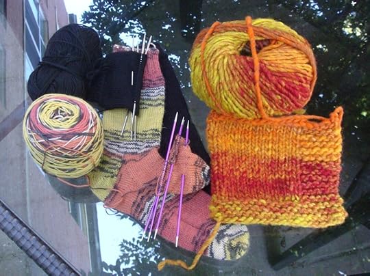 Socks, of course, but because it's summer, they are not all black. Working on a toe-up sock in a lovely color of the Online Butterfly series from a couple of years ago, and a top-down plain black sock in the workhorse Regia.