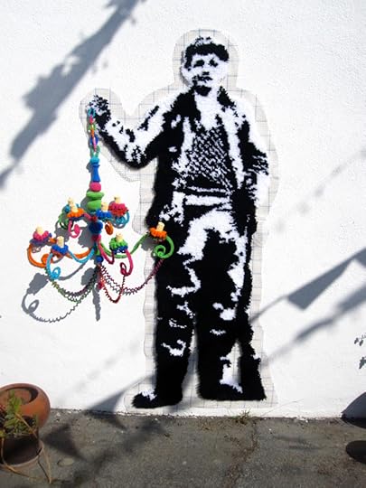 The other change taking place is that yarnbombing is no longer just about knit and crochet; this stunning piece, "Man with Chandelier", incorporates rug-hooking.