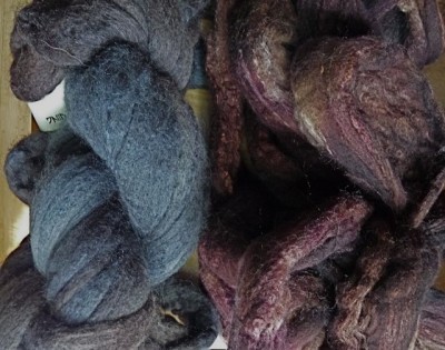The fiber on the right is Winterhaven Fiber Farm 80% Merino/ 20% Tussah, color: Mahogany – a deep, rich, brown red.