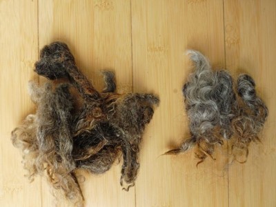 I washed the fiber in fiber wash, since it felt grease free. It actually felt dry, if I had an oil and water spray handy I would have sprayed the fiber. I carded the fiber, made rolags and spun woolen from the end.