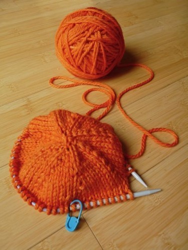 Jillian's knitting another Thorpe hat. This time out of Lorna's Laces Shepherd Bulky, color Carrot. She says, "It's my first time knitting with this yarn, it's fabulously soft and squishy. I want more. None of my local yarn shops carry it –anyone online carry it?"