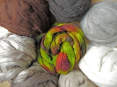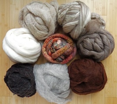 For me it's easier to see what is closer to matching my dyed fiber when I take the color away. For me it's the middle brown on the right (about 3:00, if the wheel of fiber was a clock), and an oatmeal brown (about 11:00). I'm curious about the striped roving (1:00) but not enough to sample.