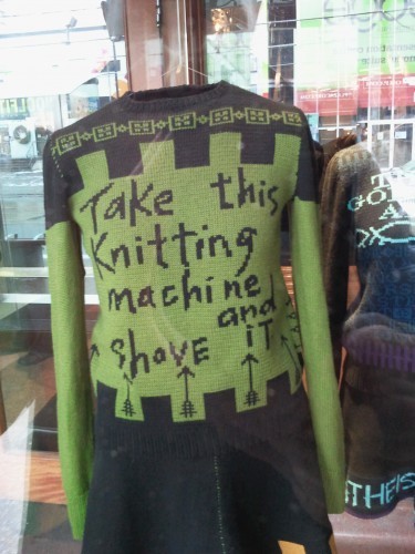 Los Angeles-based artist Lisa Anne Auerbach knits political messages into sweater sets, simultaneously rendering them comfortable and uncomfortable. Her work "Take This Knitting Machine And Shove It" has pride of place at the entrance to the hotel.