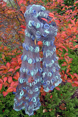 GoKnit bags are made of a durable rip-stop nylon, and they've got a drawstring and and a little strap with a snap that attaches to your belt, or your purse, or fits handily around your wrist. I have one on my belt when I'm teaching, when I'm walking, when I'm at a pub, when I'm on public transport, when I'm waiting to meet my friend at the ballet, and often even in the house.