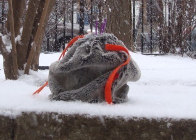 I've got the lime green one, a couple of the camo ones, a silver one, and now, my absolute favorite of the lot, a FURRY ONE! As an inveterate knitter-in-public with a well-developed passion for kitsch, this may well be the best knitting bag ever. Bonus: the fur may be faux, but it's super soft. Very pettable.