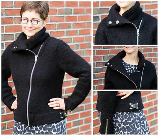 The Wild One has a cropped length, set in sleeves and waist shaping. It’s knit in pieces, denser than Lopi usually calls for, and seamed. This gives the jacket more structure and some wind resistance. Because she’s a genius, she’s lined the bits that might touch your skin, like the collar, with Berroco’s Ultra Alpaca – cozy and soft.