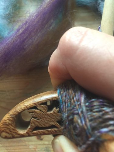 Long pieces of top need a little help. I just rest my hand on the fiber when I use a long piece. If I let it go on it’s own it would bunch and become uneven. If I pull or add too much pressure I play tug a war with the fiber (and the motor). I make sure not to push (more bunching) too.