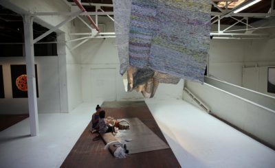 Textile artist Movana Chen recently held an exhibition at Los Angeles’ 14th Factory called “Knitting Conversations”. Chen asks friends and audiences to bring books they have read and found meaningful. She reads them, shreds them, and turns the resulting “magazine clothes” into fabric. She often teaches these participants to knit a few stitches and contribute to the whole. The garments and projects made from this fabric are then an ongoing cross-cultural, poly-lingual conversation.