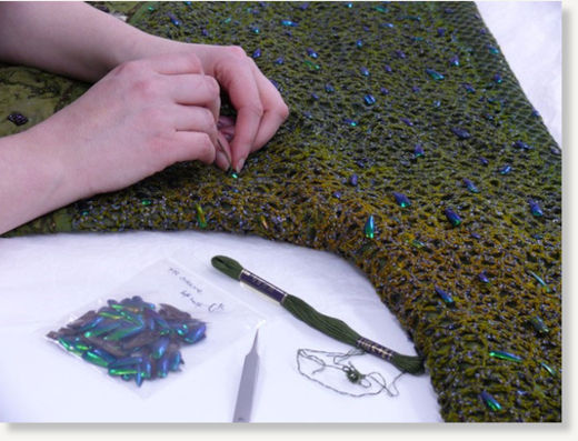 Absolutely fascinating and jaw-dropping: an article about conservation of a Victorian-era theatre costume. The garment was partially knit and partially crocheted, all by hand, but the most remarkable feature is the decoration. Those aren’t plastic pailettes: there are over 1000 actual real beetle wings sewn onto the garment.
