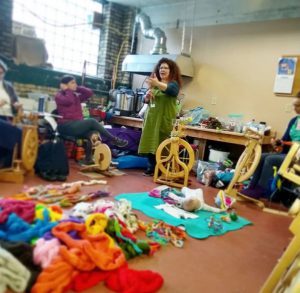 Teaching with a special guest. Photo by Emily W.Saturday I taught a Colorplay class for a fantastic group of women at the Kalamazoo Fiber & Dye Studio. We had a fun time and spun a ton of dyed fiber.