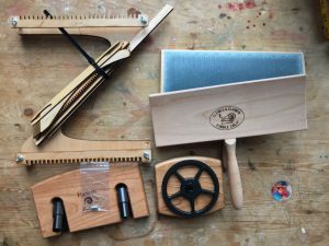 I’m good with my little tools, they live in my spin kit. My big tools like wheels, and my drum carder have their own space. But what about hand cards, combs, hackles, little looms, kates, and storage bobbins not in use?