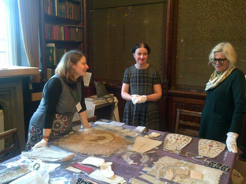 Kate Davies (center) and Debbie Bliss (right) get a tour of the collection.