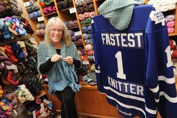 Linda Benne, a yarn shop owner from Mississauga, just outside of Toronto, is one of the world’s fastest knitters. She set the North American speed knitting record in 2004, with 253 sts in 3 minutes. She’s a lever-knitter, a method that friend of Knitty The Yarn Harlot practices. Felicia of Sweet Georgia Yarns has written a nice blog post about the method here.
