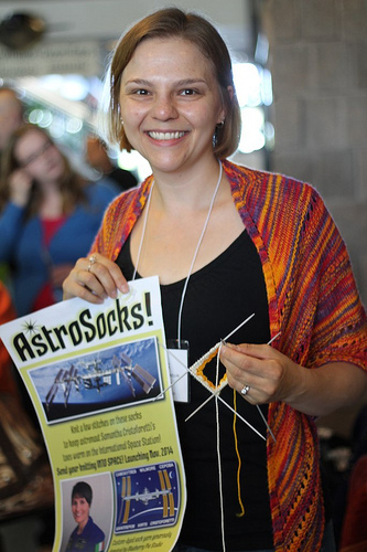 Penny Garner, a spacetweep in Washington State, went to a NASA tweetup and follows American astronaut Reid Wiseman on Twitter. He’s scheduled to launch to the International Space Station next May. He tweeted a picture of some of the socks he was packing, and she asked where astronauts’ socks come from. When he told her they’re bought at K-Mart, she offered to knit him some instead. He accepted the offer, and the initiative to make more socks for other astronauts has since, uh, skyrocketed. She contacted me a while ago (via Twitter, of course), and I finally got the first Canadian pair going last weekend, with Catherine’s help.
