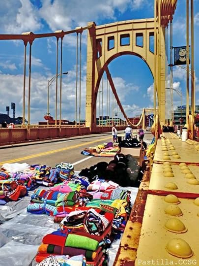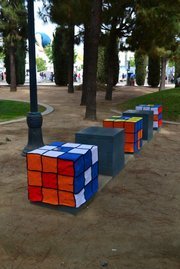 Also not knitting, but also very cool yarnbombing: Marcy Kraft created “Rubik’s Cubes” for the Children’s Park across from San Diego Convention Center. She installed slipcovers on 30 of the grey concrete seating cubes for Comic-Con this year, and hopes to cover all 60 of them for Comic-Con 2014, next year being the 40th anniversary of the Rubik’s Cube puzzle toy.