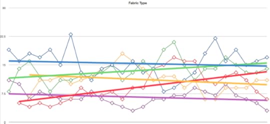 A brilliant, brilliant piece of work from Knitty Designer Bristol Ivy – the Stockinette Market. She has done a detailed analysis of the patterns that appear on Hot Right Now in Ravelry, with a view to understanding and tracking the trends in popular knitting patterns and projects. Every day – twice a day where possible – she looks at the 48 patterns that appear in the Hot Right Now list. She produces these amazing detailec charts showing various types of information about the patterns – garment type (e.g. hat, cardigan, shawl), the fabric type (lace, cable, stockinette), the yarn type (e.g. solid, tweed, self-striping), the color, and how the pattern is shown in the photos – on a model or not.