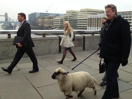 Spotted earlier this week: Stephen Fry walking a sheep across London Bridge. The author and broadcaster was awarded the Freedom of the City of London in 2011, and one of the long-held historical rights of that position is to “drive sheep and cattle over London Bridge”. He’s currently filming a documentary for UK television on the City of London, and so he took advantage of his position to take a fluffy friend for a walk.