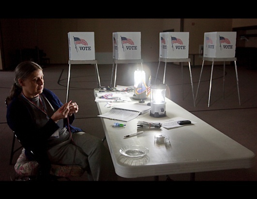 I like this a lot: a photograph of a poll worker in Kansas, knitting by lantern light as she waits for voters, during a power outage due to a winter storm. Taken February 26, 2013, from a slideshow on the ABC website (it’s the third photo).