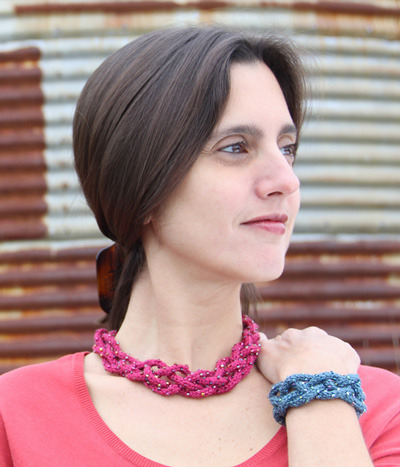 Soutache is a great introduction to bead knitting, as no special skills at all are required – it’s just 4 strands of i-cord. The kit contains everything you need – yarn, beads, a dental floss threader (yes, really, the bead knitter’s best friend) and the clasps for both the necklace and the bracelet.