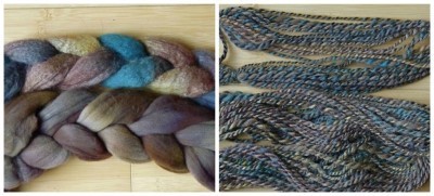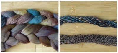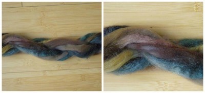Here’s a different view of before and after. The predrafted top is fluffy and smooth, easy to spin and rescued from the wrath of a frustrated spinner.