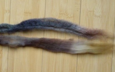 This is a before and after. The fiber on the left is the before. If I had tried to spin this as is, I would have said a lot of words, none of them nice. The fiber isn’t felted, but it’s compacted and there would have been pushing and pulling and overtwisting while I tried to spin it. The fiber on the right has been fluffed and attenuated, slightly. A dream to spin. It looks like it’s taken a big breath of air.
