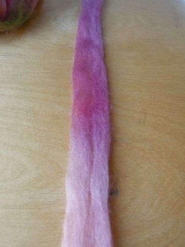 I like to combine colored tops and rovings by drafting 2 or 3 together at one time. To do this without losing my grip (or mind) I strip to a one or two-fingered width depending on how many I’m holding together.