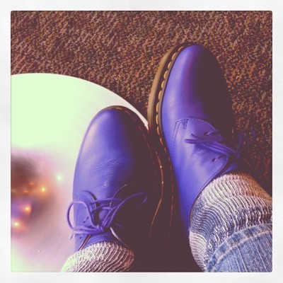 These are Dr Martens 1461 Oxfords in the unbelievable-but-true color they call Blueberry. The leather is softer than the usual Doc oxford style [which could probably be used as the outer skin of a tank].