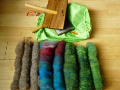 You need a drum carder (mine is a Patrick Green Deb’s Delicate Deluxe), a doffer (the pointy ice-pick-looking tool) and a diz (I use buttons. I love buttons).