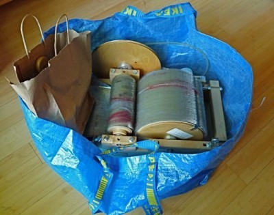 Here’s something I figured out about storing my drum carder recently. It and all the carding tools fit perfectly into a big blue Ikea shopping bag – it’s the perfect storage solution for me. Everything in one place and the bag makes hauling it off and on the shelf where I store it easy.