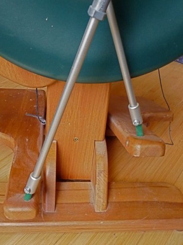 See the green bits? I call them rubber baby treadle bumpers. I thought they were the cause of the squeak and dusted them with cornstarch. Still squeaking, and probably laughing at me.