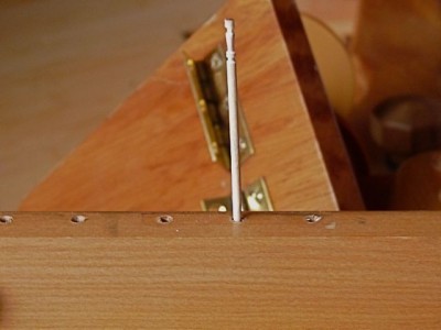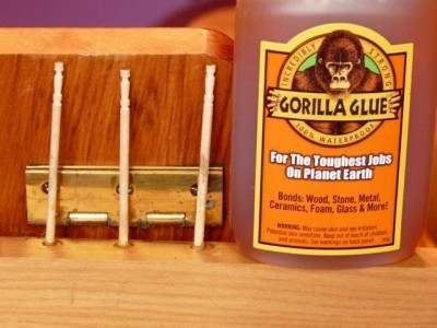 I let it dry, broke off the toothpick and lightly sanded the holes level. I cleaned and oiled the hinge and screwed it back into place, tightly.