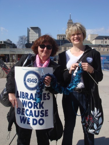 Library workers knitting on the picket line
