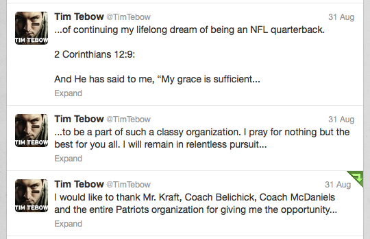 5. It’s becoming clear to most sober-minded folks that Tebow’s skill-set is not conducive to being a starting quarterback in the NFL. It says nothing about his character or faith to make this admission. He is, by all indications, a great guy with a great testimony and a great heart. This does not make him a great quarterback. And to be more direct, I have to wonder if anyone close to Tebow is enabled to speak truthfully to him about this matter. When he was cut from the Patriots roster last week, he characteristically went out with his head high and respect on display. On his Twitter, he thanked the Patriots organization for the opportunity, and then he tweeted a few Bible verses, and then he tweeted that his dream is still to be an NFL quarterback. Now, perhaps this dream is realistic. But most people, including people who want it to be realistic, are acknowledging it doesn’t seem realistic at all. He’s had ample opportunities. Here’s my thing: The NFL is full of starting players who played one position in college that is not their position today. This includes college starting quarterbacks who find their place in the NFL as safeties, running backs, tight ends, etc. I just have to ask: At what point is Tebow’s inflexibility about his dream actually a manifestation of pride? At what point does he need to say, “Well, I can’t be a quarterback, but I will play fullback”? I can’t say. Maybe you can’t say. But surely we are close to that day? I don’t know. I just hope he doesn’t ride his stubborn dream into athletic obscurity. He is, I think, talented enough to play in the NFL, but (probably) not as quarterback. I will close with this: