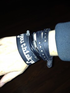 Most of my bracelets are just funky looking. I really dig little rubber ones, or leather ones with spikes or pyramid studs. But some of them have my fave bands on them and several have fun sayings on them that spoke to me (anything from “Zombies want me for my BRAINS!” to “Mean people suck!” – both of which are totally true, by the way). But there’s one bracelet in particular that I bought several years ago, and used to wear a lot, until a point came where I didn’t, and lately, I’ve been wearing it again, for a good reason. The bracelet reads simply “Who do you think you are?”