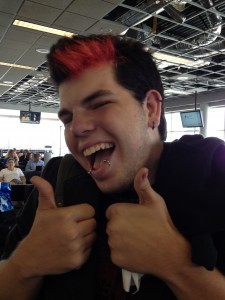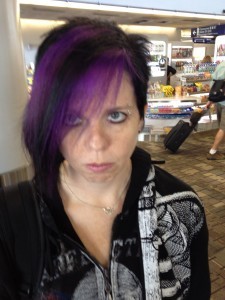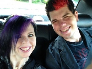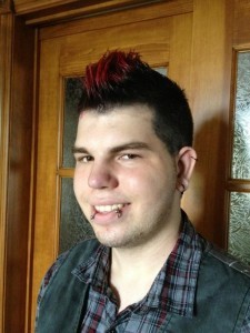 He’s pierced and has recently begun styling his hair in a wicked red and black mohawk. He’s the sweetest guy and about the most harmless person you could ever meet. And you’ve likely seen my hair – the pics on my website are way outdated. My hair is purple and black, with lil spikes at the back. Has been for a while now.