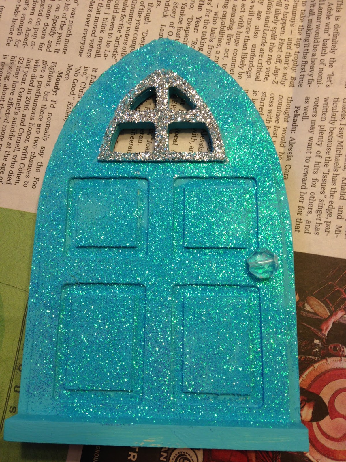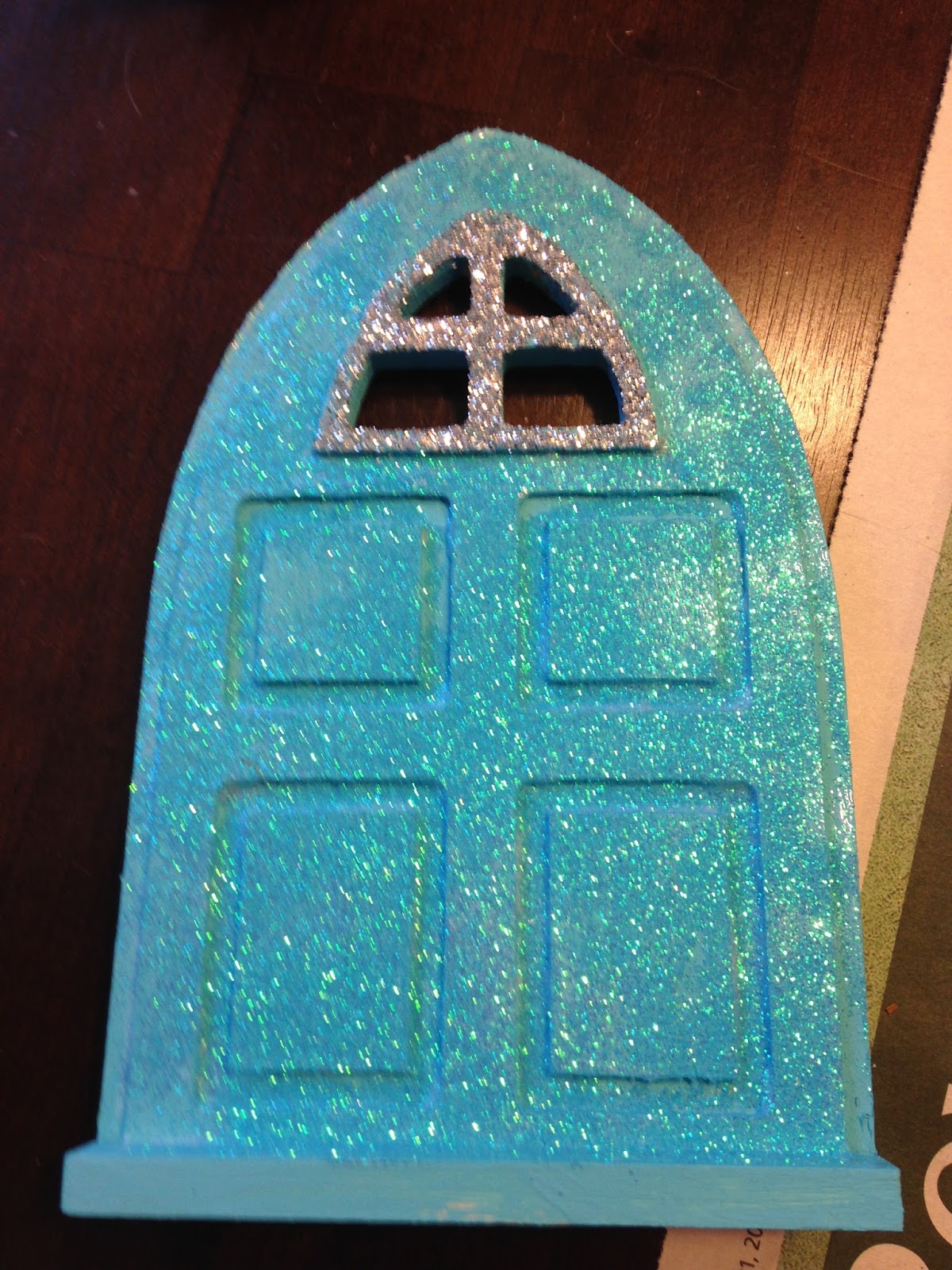 Thankfully, the glitter has a shaker lid and I shook that stuff all over the door. Not thick like the window, but just enough to give a good coat. Then I turned it over and dumped off the excess. If I saw a spot that didn't get covered I shook more out, until I was satisfied.
