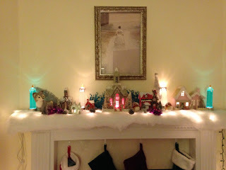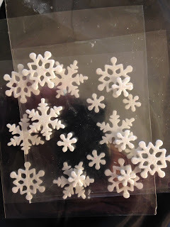 A few years ago, Sis and I made our own holiday houses, basing them off the old Putz houses we had as kids. We bought a gob of different holiday/winter themed scrapbook stickers. We just happened to have a large package of snowflakes