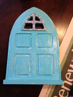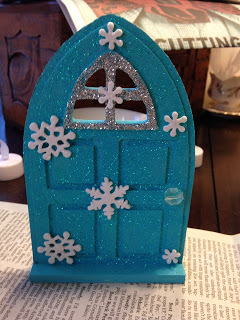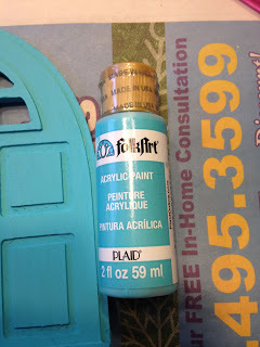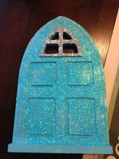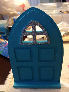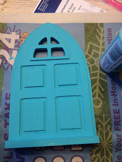 Totally no thrills, no frills. But they're really cute. Next, since the colors for Mid-Winter are an icy blue and silver, I went into our craft stash and found blue paint I thought would work. I was stunned when it was the EXACT color I wanted. When you find your color just paint the entire door. I even painted inside the little windows so no wood would show through.