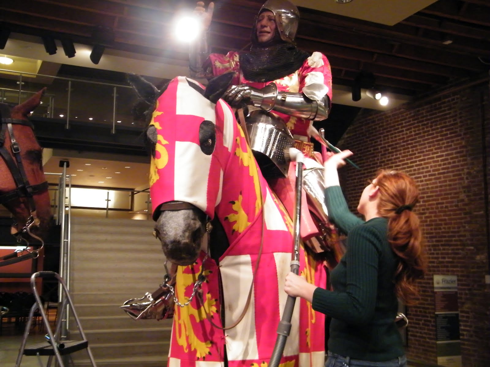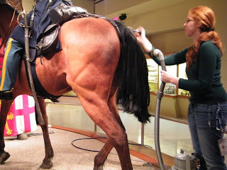 and attachments) and goes around pampering our small bunch of prima donnas. Just this week was spa day for the two men on horseback in the Great Hall. As I came out of the Education Center, Anna was gently tending to our gentlemen and their mounts. While she lightly runs what looks like a powder brush over manes and tails, she uses the vacuum to remove the stirred up dust. She never gets too close for fear of sucking the hair itself up. I agree that I can't think of anything worse than a bald horse. When I stopped to watch her, she informed me, "When I vacuum their faces I think they're probably really uncomfortable." That is the second thing I can whole-heartedly agree with. I can't imagine attempting to stand still while someone sucked up my face with the vacuum. This gives me pause and I realize no matter how hard I work, I certainly wouldn't want the spa service perks given to the tableau employees. I'll just stick with the ability to go home in the evening.