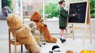I remember forcing my poor sister, dog and stuffed animals sit in chairs as I "taught" them on my chalkboard. My Mom even bought me old textbooks to use in my teaching endeavors.