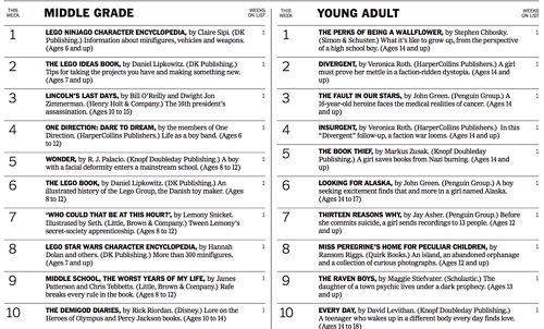 In news that only matters to publishing nerds, the New York Times has changed its bestseller lists to become format neutral (so it counts e-book sales and doesn’t distinguish between hardcover and paperback), and is now split between young adult books and chapter books written for 8- to 12-year-olds.