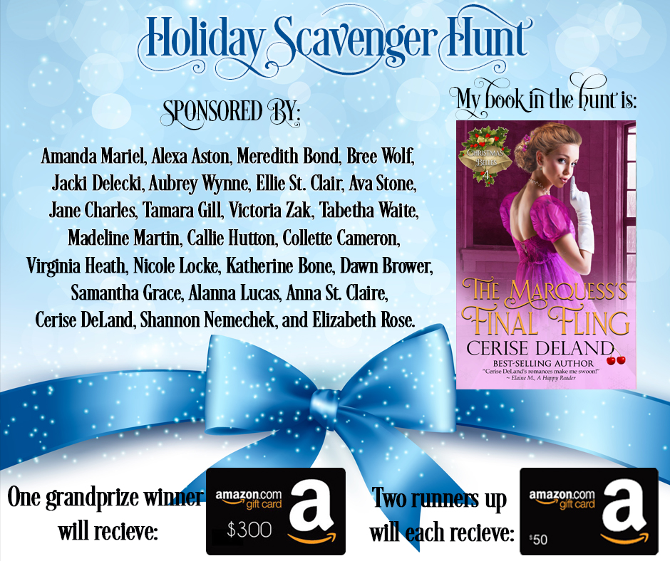 Already do both? Then write to tell me so at cerise.deland@ymail.com and tell me one book you read of mine that you loved! I will select a winner on December 20 by 5 EST and announce it on Facebook here.The next stop in the scavenger hunt is: Anna St. Claire at https://www.facebook.com/authorannastclaire/ Rules: Must be 18 or older to enter.Giveaway’s are in no way endorsed or sponsored by any business or entity beyond the authors.To qualify for the Scavenger Hunt giveaway you MUST answer all 25 questions correctly.All answers must be recorded on the Google entry form and nowhere else. If someone posts an answer publicly, their comment will be deleted by the authors and will not count.Amanda Mariel will notify the Scavenger Hunt winners via email within one week of the giveaway ending. Amanda Mariel will also deliver the grand prize $300 Amazon gift card as well as the two runners up $50 Amazon gift cards.Individual authors are responsible for announcing the winners of their giveaways as well as delivering their prizes.See the full set of rules, terms, and conditions on the Google entry form.For a full list of the scavenger hunt stops go here http://amandamariel.com/historical-holiday-scavenger-hunt-giveaway/ ☺