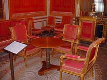Abdication Room as it is today.Among the rooms is the one in which Napoleon signed his abdication April 13, 1814. Adjacent is his bedroom where the night before, he drank poison. Ill and then purged by an elixir brought by his servants, Napoleon recovered to sign the document. He grumbled that "even poison failed him."This abdication agreement was between Napoleon and the representatives of Austria, Russia and Prussia and by this treaty, Napoleon was exiled to the island of Elba. After signing in this room, he went to the steps facing the main entrance to the palace and addressed his officers assembled in the courtyard. These are my pictures of the steps where he stood and the view he would have had of the courtyard and his imperial gates, which still have the two eagles atop.