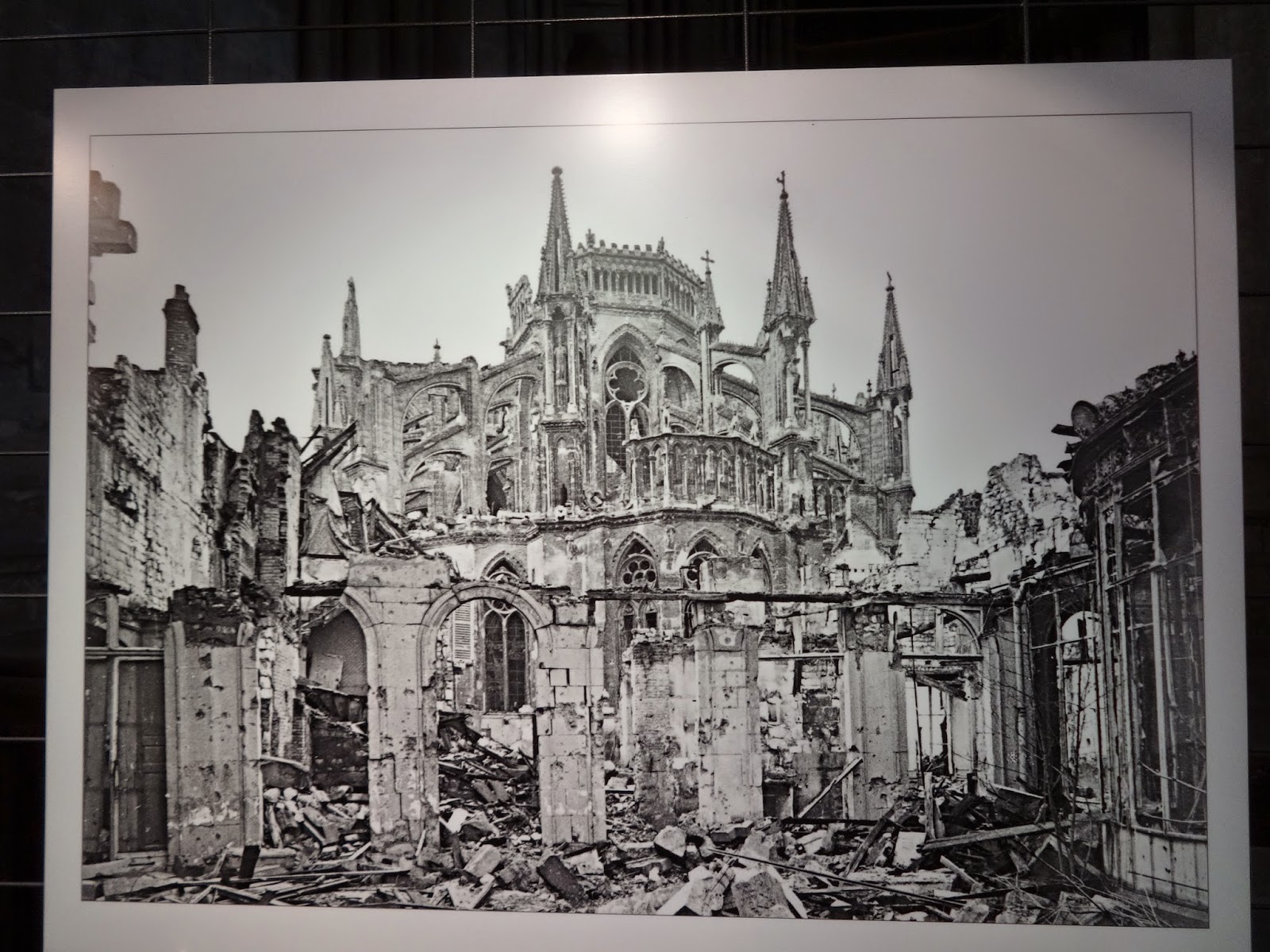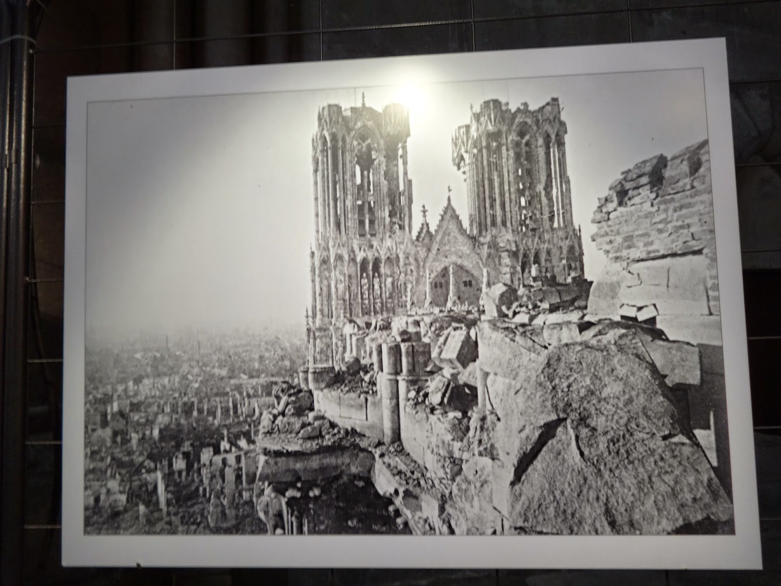 Reims is known also for its near destruction during La Grande Guerre. In 1914 as German troops swept through northern France toward Paris, Reims cathedral was claimed by the German army. In fact, because German troops had few supplies and were unable to keep up by supply train with their own advance, they bedded down in the church. With straw on the floor and cook tents inside the church, they took over the church and the surrounding city and its inhabitants. When the French army countered their control over the city and people, the Germans hastily retreated. Before they did, they set fire to the church. Here are a few pictures I took of the pictures on display currently inside the church. Here you can see that the roof was blasted through and sunlight shown inside. After the war, the church was restored. Today, we have this lovely church to visit and recall the coronations of all French kings, except the last one, Charles X, restored Bourbon and brother to ill-fated Louis XVI.