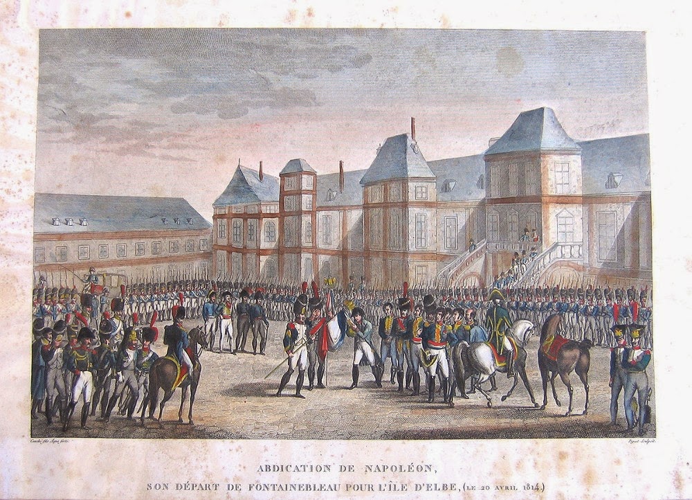 Old print of 'Abdication of Napoleon, His Departure from Fontainebleau for the Island of Elba'.